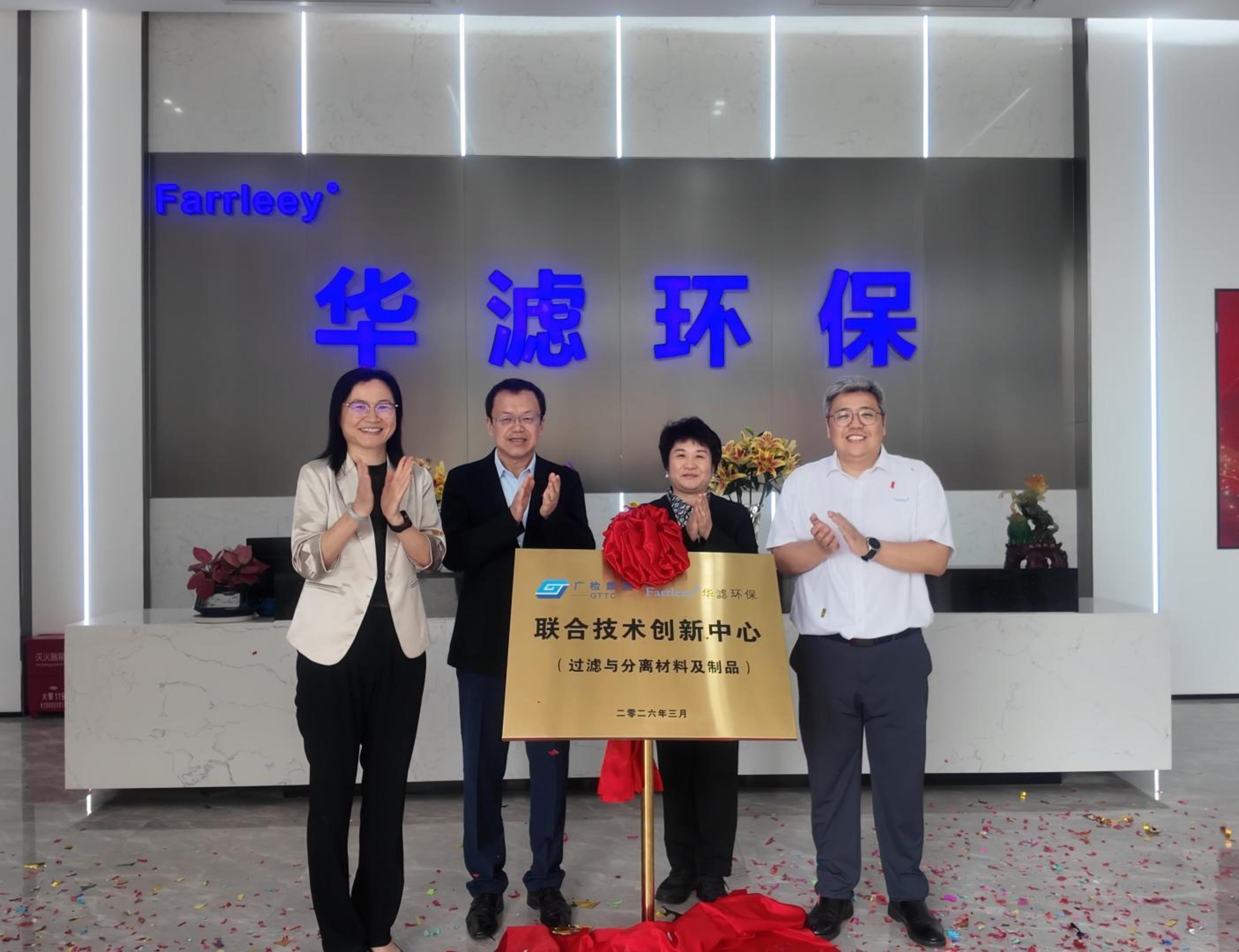 3 月 26 日,广检集团与华滤环保联合技术创新中心揭牌仪式在华滤环保(广东)有限公司隆重举行。中国纺织工业联合会副会长李陵申、中国产业用纺织品行业协会会长李桂梅应邀出席并见证。广州检验检测认证集团有限公司广纺院副院长王向钦、高检中心部长朱锐钿,华滤环保总经理王锦、研发中心负责人等领导共同出席本次揭牌仪式。